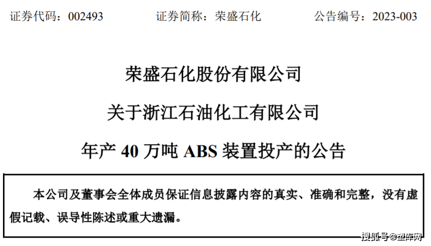 浙江石油化工无限公司成立于2015年6月18日,是一家平易近企控股、国企参股的夹杂所有制企业。2023年1月16日,荣盛石化发布通知布告,控股子公司浙石化正在舟山绿色石化投资扶植的年产40万吨ABS安拆于近期投料成功,目前已成功产出及格产物。