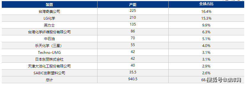 据统计,2021年,全球ABS产能、产量别离达到1178万吨和1038万吨,2021年中国ABS树脂产量约为445。47万吨。2022年,全球产能前十ABS企业合计产能940。5万吨/年,占全球ABS产能68。6%。此中,奇美、LG化学和英力士别离以16。4%、15。3%和9。9%的产能占比位居前三。