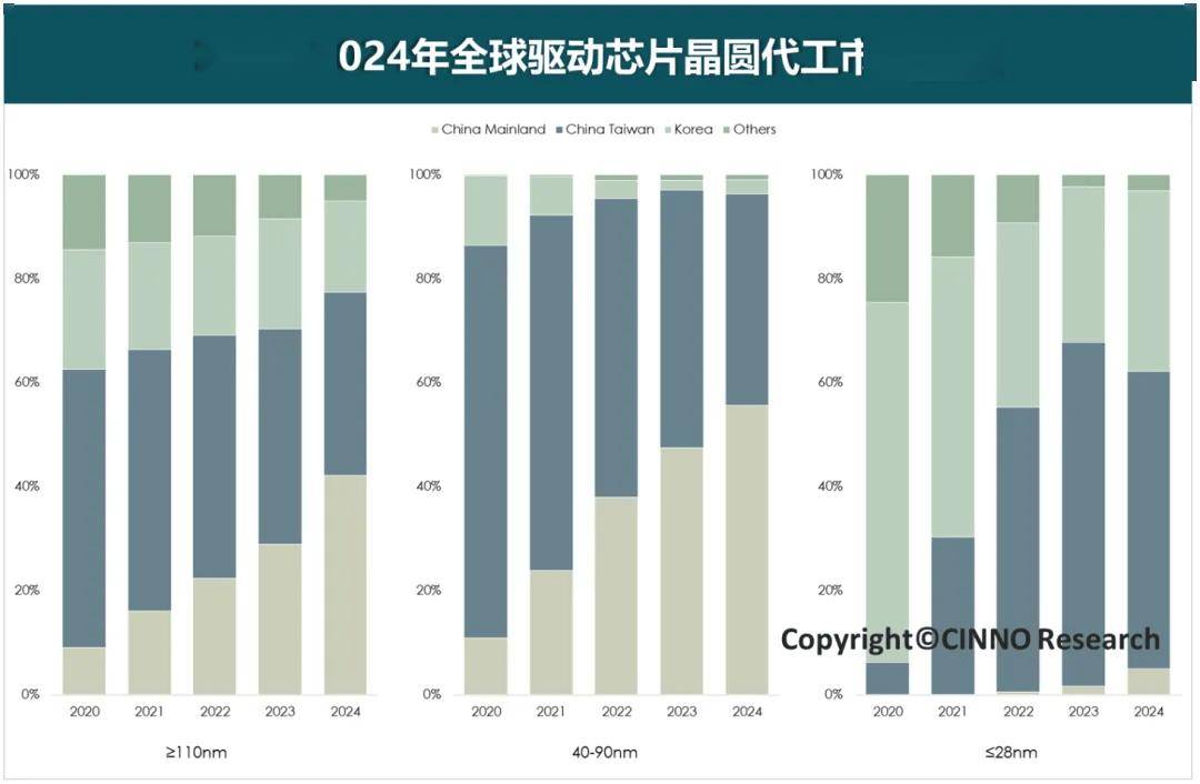 显示驱动芯片是显示面板的焦点组件,担任节制每个像素的开关、亮度及色彩表示,其机能间接影响屏幕的显示结果和功耗。做为全球最大的显示面板出产国,中国正在TFT-LCD和AMOLED范畴的产能占比持续攀升,这也使得中国成为全球显示驱动芯片的最大消费市场。关税政策的调整可能对财产链发生双沉影响:一方面,若面板出口关税提高,可能减弱中国制制的性价比劣势,影响全球市场份额;另一方面,若驱动芯片进口成本因关税上升,将间接添加面板企业的出产成本,进而影响终端产物的合作力。因而,正在鞭策面板财产全球扩张的同时,加快驱动芯片的国产化替代,降低对外依赖,将成为保障中国显示财产链平安取合作力的环节行动。近日,中国半导体协会发布了“关于半导体产物“原产地”认定法则的通知“,此中定义了 “集成电”原产地按照四位税则号改变准绳认定,即流片地认定为原产地。因而,驱动芯片代工流片所正在地成为了目前关税认定的环节。110nm及以上工艺节点次要使用为电视、显示器等大尺寸TFT-LCD显示驱动芯片市场,中国晶圆代工产能实现了逾越式成长。2020-2024年间,市场份额从9%快速攀升至42%,超越中国(35%)和韩国(18%),成为全球最大的供应;40-90nm次要使用市场是智妙手机TDDI(触控取显示驱动器集成)和部门AMOLED驱动芯片市场,中国代工份额从2020年的11%飙升至2024年的56%,展示出强劲的合作力;28nm及以下次要市场为高端AMOLED驱动芯片,目前仍被中国(57%)和韩国(35%)从导,中国仅占5%份额。这部门产物次要供应品牌手机的高端机型,手艺门槛高,对晶圆代工的工艺不变性和良率要求严苛。