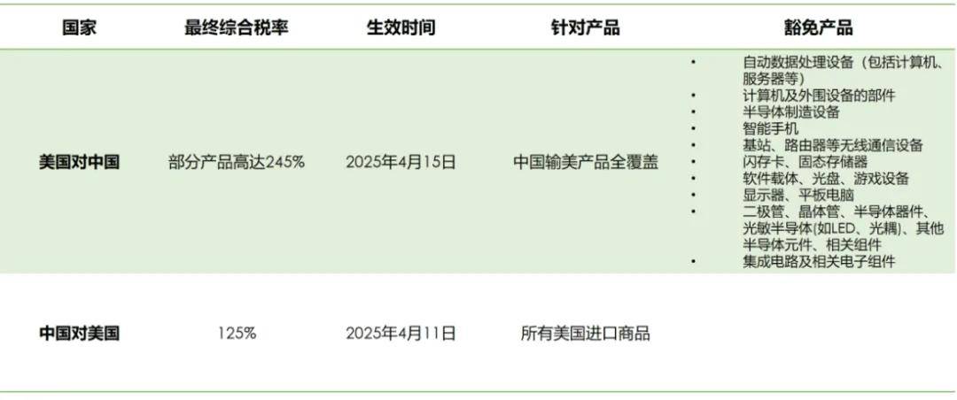 2025年4月,中美商业争端再度升级,两边环绕关税展开多轮高强度博弈。美国以“对等关税”为由,通过多次加税对中国新能源电池、智能电网设备等环节商品实施赏罚性关税,将部门产物税率推高至245%的汗青峰值;中国则采纳“同步反制”策略,对美进口商品全面加征125%关税,并辅以稀土出口管制等精准冲击手段,并正在声明中强调本轮反制即为最终立场,不再就关税问题取美方进行新回合磋商。虽然美国正在手艺依赖范畴(如半导体、医药原料)宽免部门中国商品关税,但两国商业壁垒已创汗青新高。这场以“极限税率叠加”为特征的匹敌,不只沉构全球供应链款式,更间接导致美国通缩压力激增取中国出口市场多元化加快。”4月2日:美国颁布发表对所有商业伙伴实施“对等关税”,此中对中国商品加征34%关税。叠加此前20%的税率,中国输美商品分析税率升至54%。4月4日:中国颁布发表自4月10日起,对原产于美国的所有进口商品加征34%关税,并实施稀土出口管制等办法。4月8日:美国将对中国商品的“对等关税”税率由34%提高至84%,叠加此前税率后累计达104%。4月9日:中国同步将美国进口商品关税税率提高至84%。美国随即颁布发表将中国商品税率进一步提至125%,并宽免75个国度的关税90天(保留10%基准关税)。4月10日:白宫,对华125%的关税包含此前已存正在的20%税率,两者叠加后总税率达145%。4月11日:中国颁布发表将对美关税同步提高至125%,并声明不再跟进后续加税。同日,半导体)的高额关税,涉及出口额约963。9亿美元。4月15日:美国白宫网坐发布动静,提到因中国针对美 “对等关税” 采纳报仇办法,中国出口到美国的商品面对最高达 245% 的关税。4月16日:白宫告急称,245%并非新增关税,而是现有多轮关税叠加的成果,包罗125%的“对等关税”、20%的芬太尼相关赏罚性关税,以及301条目下的其他关税。4月22日:特朗普及其内阁稠密称将“大幅降低”对华关税,但强调“不会降至零”,并要求中国先采纳步履。特朗普称“145%的关税太高了”,财长贝森特也暗示关税和“不成持续”,可能正在“将来几个月”逐渐降温。动静称,美国对华关税可能调整至约50%至65%这一税率区间。还有动静称,特朗普正正在考虑采纳一种“分级纳税”的轨制。4月2日:美国颁布发表对所有商业伙伴实施“对等关税”,此中对中国商品加征34%关税。叠加此前20%的税率,中国输美商品分析税率升至54%。4月4日:中国颁布发表自4月10日起,对原产于美国的所有进口商品加征34%关税,并实施稀土出口管制等办法。4月8日:美国将对中国商品的“对等关税”税率由34%提高至84%,叠加此前税率后累计达104%。4月9日:中国同步将美国进口商品关税税率提高至84%。美国随即颁布发表将中国商品税率进一步提至125%,并宽免75个国度的关税90天(保留10%基准关税)。4月10日:白宫,对华125%的关税包含此前已存正在的20%税率,两者叠加后总税率达145%。4月11日:中国颁布发表将对美关税同步提高至125%,并声明不再跟进后续加税。同日,美国海关颁布发表宽免部门中国商品(如智妙手机、半导体)的高额关税,涉及出口额约963。9亿美元。4月15日:美国白宫网坐发布动静,提到因中国针对美 “对等关税” 采纳报仇办法,中国出口到美国的商品面对最高达 245% 的关税。4月16日:白宫告急称,245%并非新增关税,而是现有多轮关税叠加的成果,包罗125%的“对等关税”、20%的芬太尼相关赏罚性关税,以及301条目下的其他关税。4月22日:特朗普及其内阁稠密称将“大幅降低”对华关税,但强调“不会降至零”,并要求中国先采纳步履。特朗普称“145%的关税太高了”,财长贝森特也暗示关税和“不成持续”,可能正在“将来几个月”逐渐降温。动静称,美国对华关税可能调整至约50%至65%这一税率区间。还有动静称,特朗普正正在考虑采纳一种“分级纳税”的轨制。