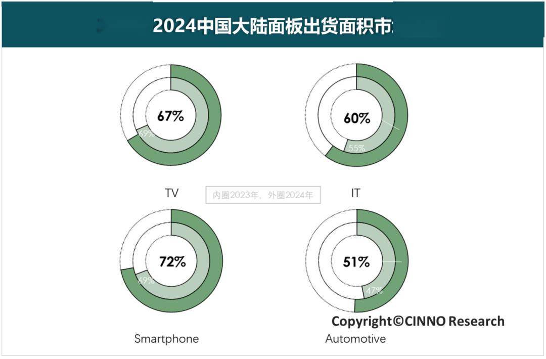此次美国加收对等关税的影响是全球性,全方位的。光电显示行业正在过去近三十年时间里,通过全球分工合做,取得了庞大的成绩,正在当前美国逆全球化策略中,也不成避免遭到较大的冲击。出格是中国驱动芯片市场,正在此次关税和中遭到的影响值得关心,起首中国做为全球光电显示制制大国,商业和首当其冲,其次驱动芯片是光电显示模组焦点零件,且驱动芯片属于半导体范围,又进一步叠加了中美半导体合作的要素,影响愈加复杂。按照CINNO Research的数据,2024年中国面板厂正在全球消费电子使用产物市场的表示进一步巩固了领先地位,次要产物的出货份额均实现同比增加,此中TV面板:占比达67%(同比和23年基板持平),占领近七成市场,反映中国正在超大尺寸和高端显示手艺(如Mini LED背光)上的劣势。智妙手机面板:同样占比72%(同比增加3个百分点),受益于国产OLED产能(如京东方、维信诺等),逐渐打破韩国厂商垄断。IT类面板(显示器/笔电):份额60%(同比增加5个百分点),目前中国正在TFT-LCD范畴从导力加强,但高端OLED笔电面板仍需冲破。车载显示面板:占比51%(同比增加4个百分点),跟着新能源车市场扩张,占领全球一半以上份额。TV面板:占比达67%(同比和23年基板持平),占领近七成市场,反映中国正在超大尺寸和高端显示手艺(如Mini LED背光)上的劣势。智妙手机面板:同样占比72%(同比增加3个百分点),受益于国产OLED产能(如京东方、维信诺等),逐渐打破韩国厂商垄断。IT类面板(显示器/笔电):份额60%(同比增加5个百分点),目前中国正在TFT-LCD范畴从导力加强,但高端OLED笔电面板仍需冲破。车载显示面板:占比51%(同比增加4个百分点),跟着新能源车市场扩张,国产面板正在车载范畴也实现冲破,占领全球一半以上份额。