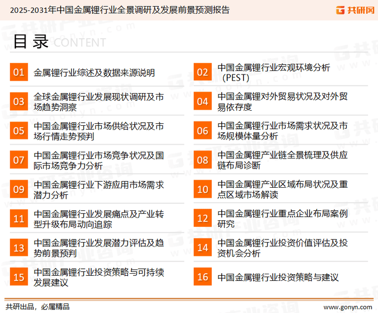 共研财产研究院通过对息阐发、业内资深人士和相关企业高管的深度,以及阐发师专业性判断和评价撰写了《2025-2031年中国金属锂行业全景调研及成长前景预测演讲》。本演讲为金属锂企业决策人及投资者供给了主要参考根据。