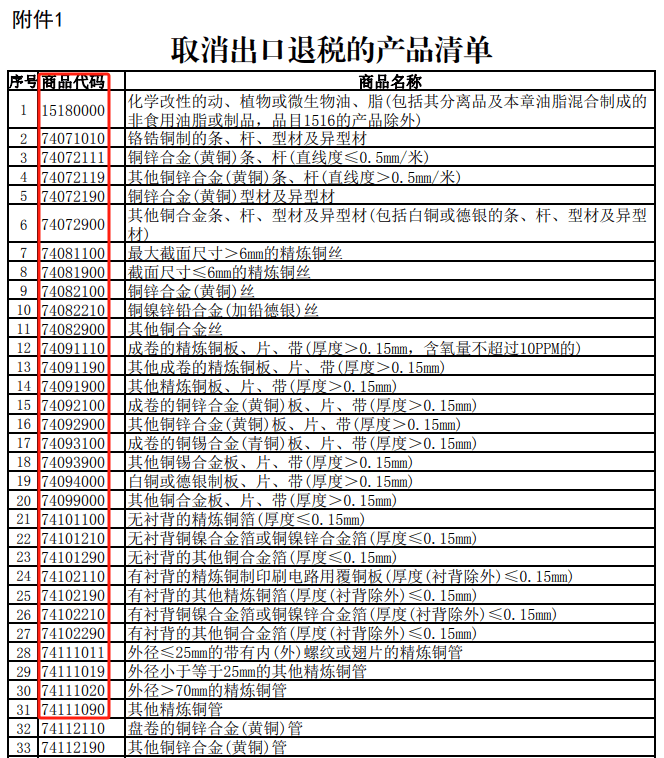 关于打消出口退税的产物清单,总共包含59个产物,除了通知布告提到的产物,好比精辟铜管、其他铜合金条等。
